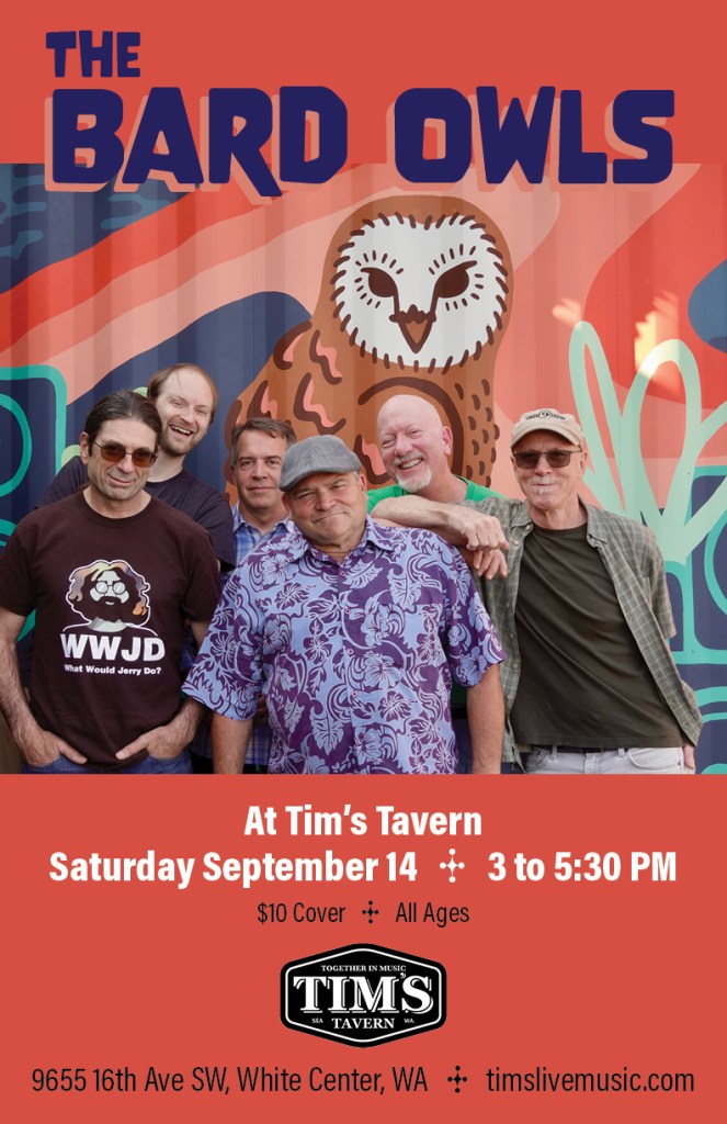 Need an option to the Apple Cup? This Saturday, the Bard Owls perform at our long-awaited gig at Tim’s Tavern at 3:00 pm. “Tim” stands for “Together in Music,” and we’d love for our Drunken Owl audience to gather together at Tim’s to hear three sets of the tunes we’ve brought to the Saloon stage for the past two years.