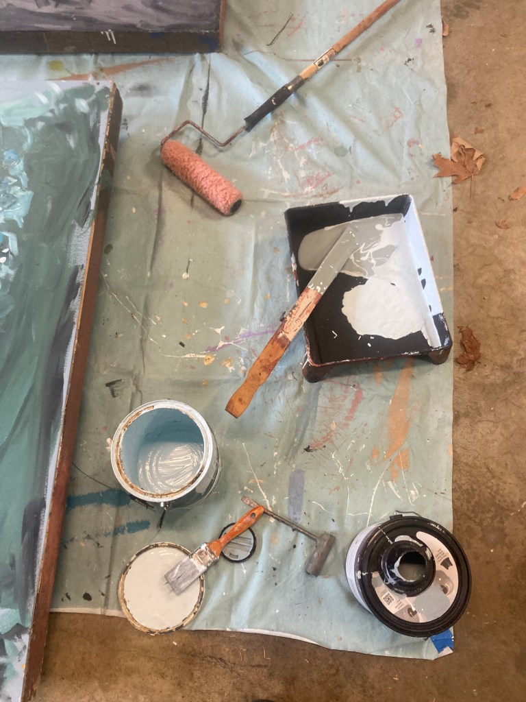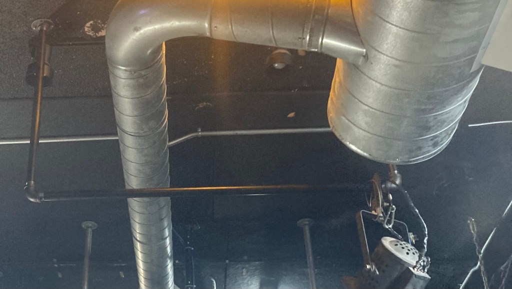 Phil Kelley and I installed a new set of pipes from which to hang our two new lighting instruments (delivery scheduled soon.) Our blocks and flats on the floor will be properly illuminated!