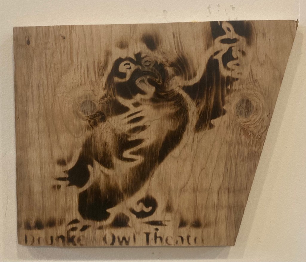 Because they’ve sponsored us by placing ads in our programs, I had given Manny a sample of our Drunken Owl Theatre burn art.