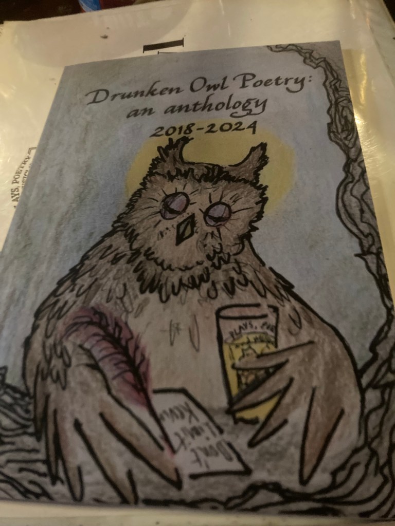 Look what arrived in the mail! We’ll have copies of the Drunken Owl Poetry Anthology for sale on our merch table. Suggested donation $10 – $20.
