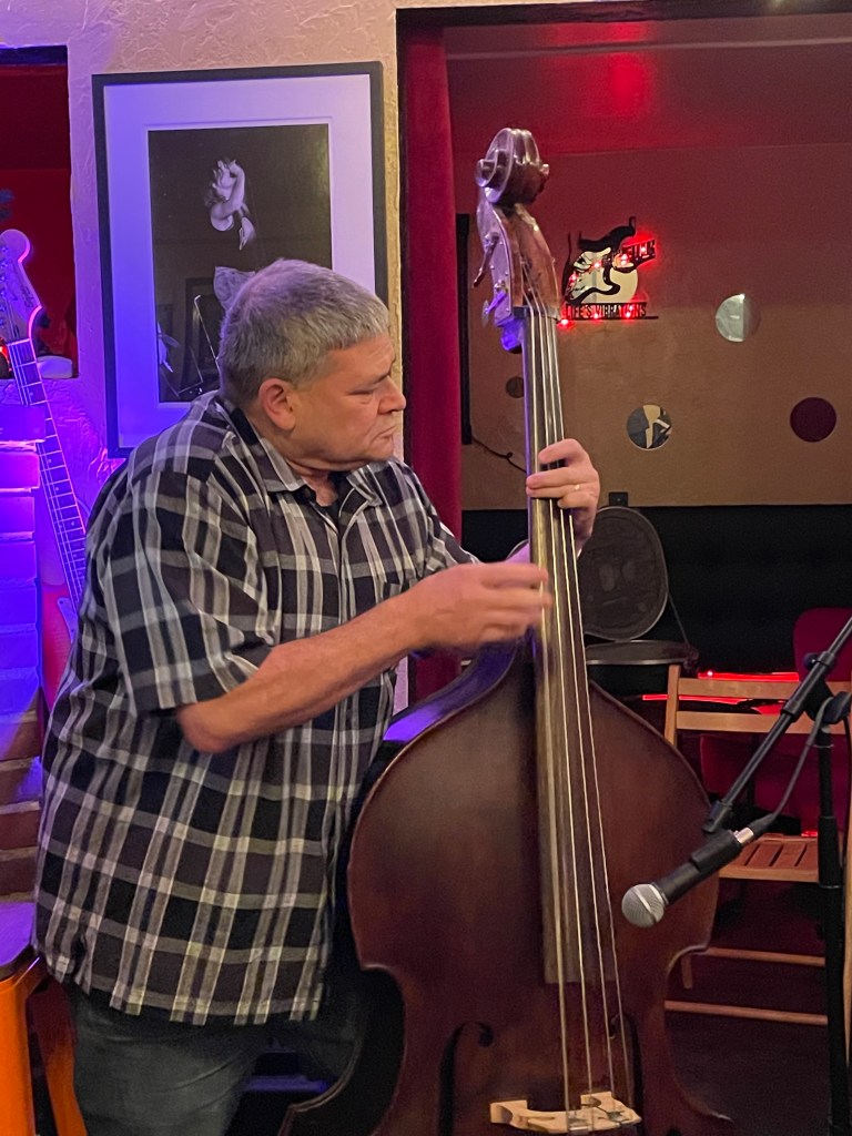 Mike Goldfine (musician) began playing drums at the age of ten and switched to bass as a teenager. Following his mother’s lead, he played in the orchestra pit for several theatrical productions in the Puget Sound area and made his acting debut in “Twelfth Night.” He plays bass and drums in several local bands and has played at Drunken Owl many times.