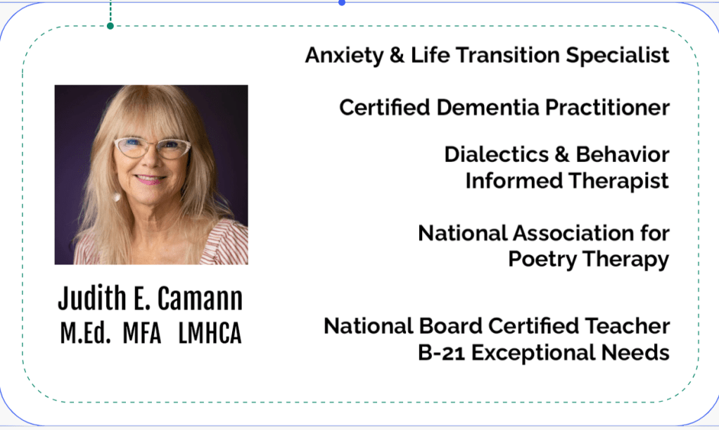 Judith Camann M.Ed. MFA (Poet) has two books of poetry: In the Spill Again and A Poet Studies for the National Counseling Exam available at Barnes and Noble. A Licensed Mental Health Counselor Associate, Camann is a member of The National Association for Poetry Therapy & is an Editorial Board Member of The Journal of Poetry Therapy. Learn more about her at www.judithcamann.com.